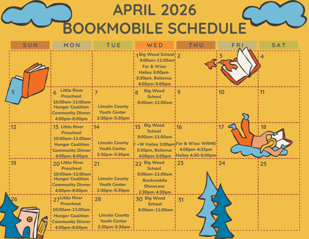 The Bookmobile travels to locations throughout the Wood River Valley year ’round. Look for monthly updates on the schedule below.