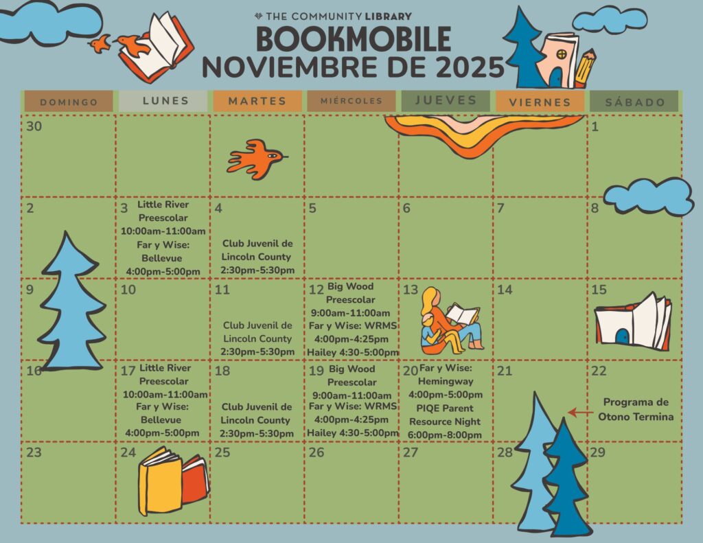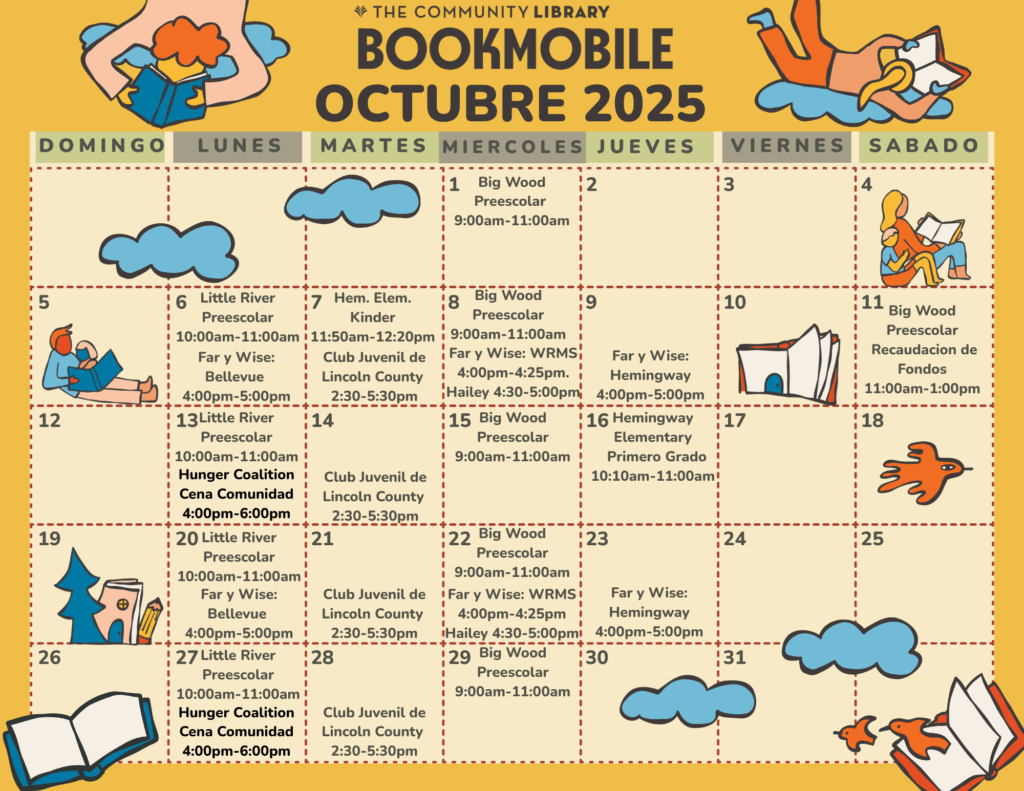 The Bookmobile travels to locations throughout the Wood River Valley year ’round. Look for monthly updates on the schedule below.